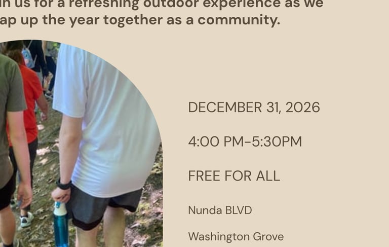 Close out the year with intention and connection on our Last Day Hike at Washington Grove. This community-centered event invites you to step into nature, reflect on the past year, and honor your personal growth